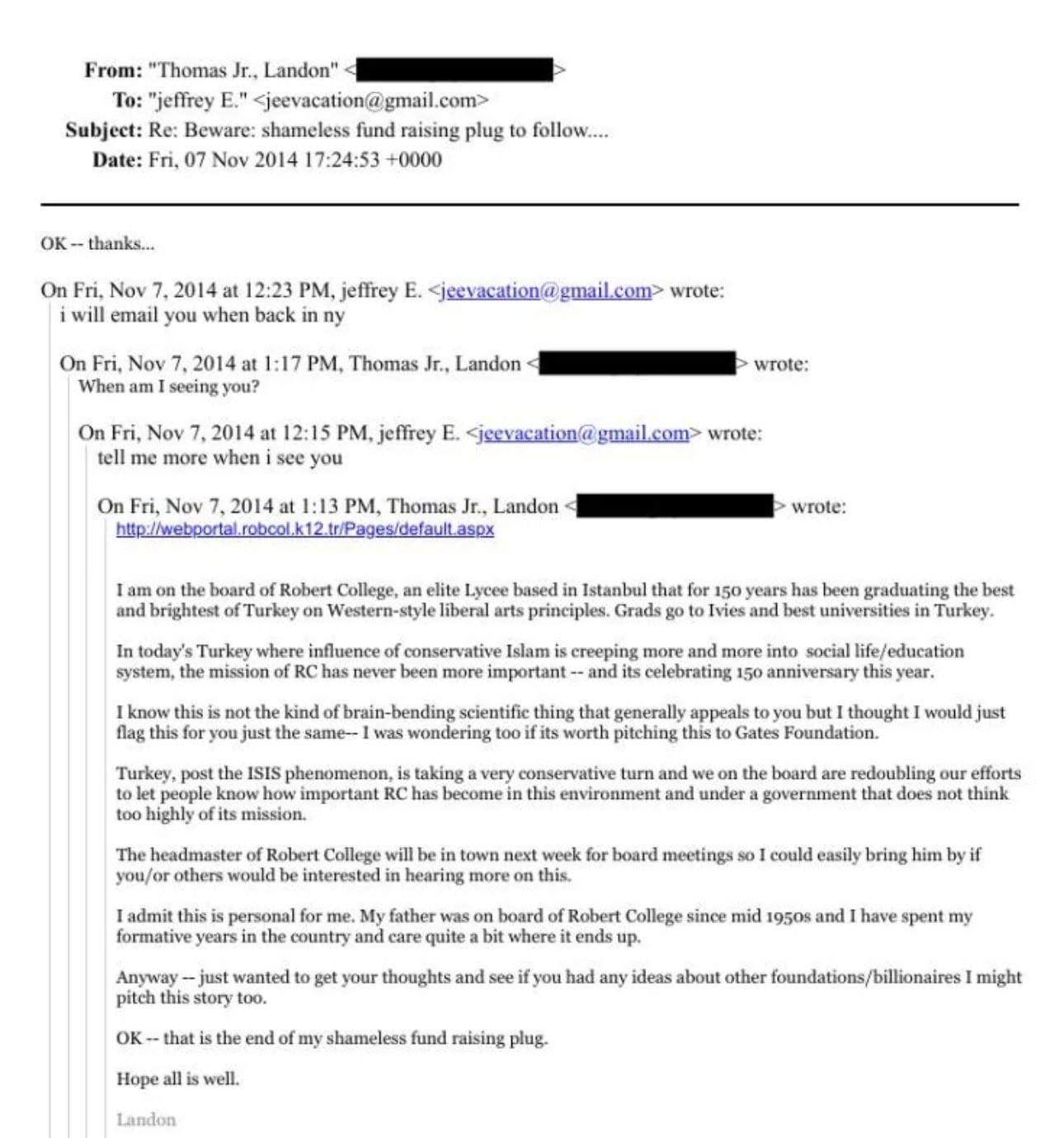 The author of the email presents himself as a board member of Robert College, an elite high school in Istanbul historically aligned with Western liberal education.